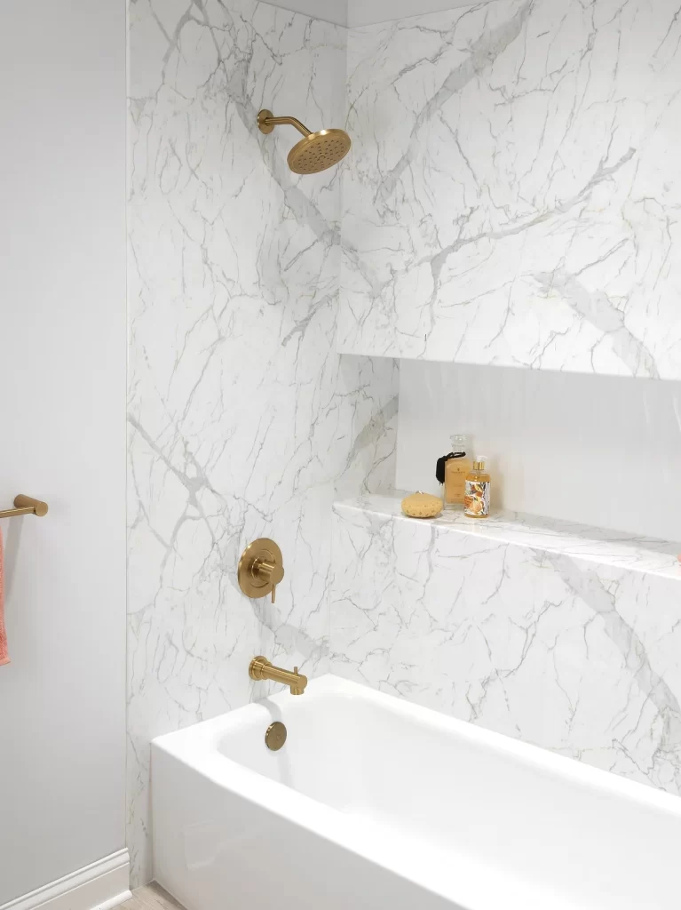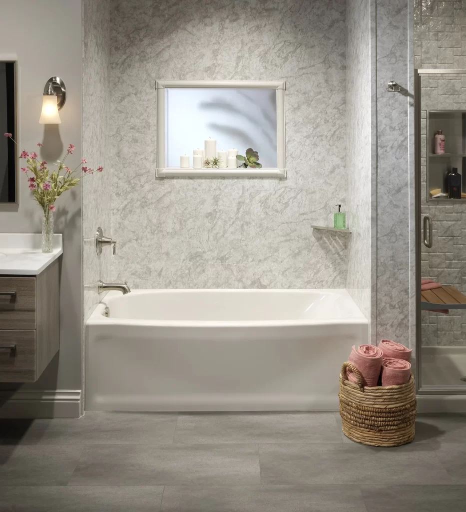 Personalize your remodel with a variety of beautiful wall styles and finishes. From timeless marble patterns to modern textured looks, each option is durable, low-maintenance, and crafted to complement any bathroom design.